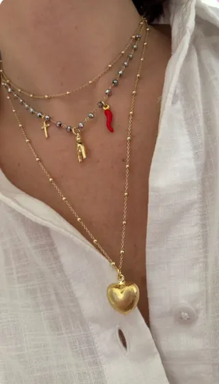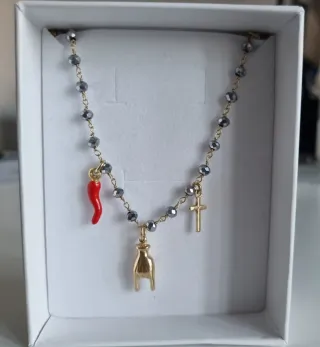 Collana in argento 925, impreziosita da elementi simbolici. Molto luminosa. Made in Italy, fatta a mano. - Perle grigie sfaccettate. - Ciondolo a forma di cornetto rosso. - Ciondolo a forma di mano scaramantico. - Ciondolo a forma di croce.