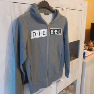 Felpa grigia con cappuccio e zip, perfetta per un look casual. - Logo DIESEL stampato sul davanti. - Tasche laterali. - Polsini e fondo a costine.