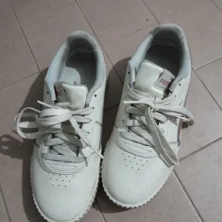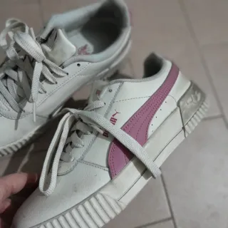 Scarpe Puma da donna in ottime condizioni, perfette per un look casual. - Design sportivo e alla moda. - Dettagli in rosa vivace. - Tomaia in pelle sintetica.