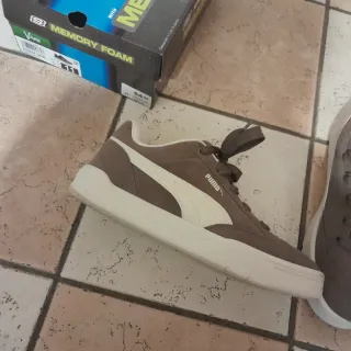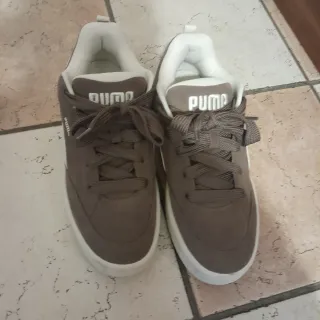 Scarpe Puma da uomo in tonalità marrone grigio con dettagli bianchi. Perfette per un look casual. - Toma in materiale scamosciato. - Suola in gomma bianca. - Logo Puma sulla linguetta e sul lato.