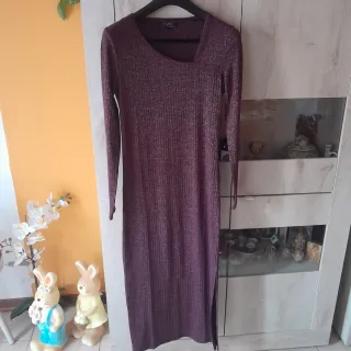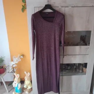 Elegante vestito lungo con un design moderno. - Tessuto a coste con fili metallici. - Scollo asimmetrico. - Maniche lunghe. - Spacco laterale.