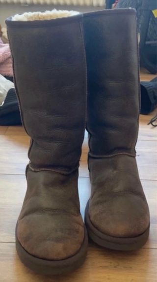 Stivali alti in morbida pelle scamosciata marrone, foderati internamente in calda lana. - Design classico e confortevole. - Altezza media. - Ideali per l'inverno.