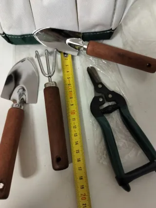 Set di attrezzi da giardinaggio compatto, ideale per prendersi cura delle piante. - Include una sacca porta attrezzi. - Comprende una forca, delle forbici, una paletta e una paletta a punta. - Gli attrezzi hanno manici in legno.
