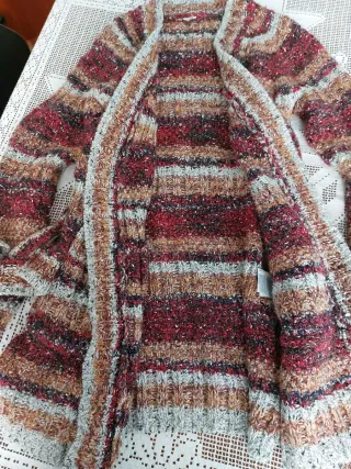Cardigan donna con fantasia a righe multicolor. Un capo versatile e caldo. - Design aperto sul davanti. - Tasche applicate. - Cintura in vita.