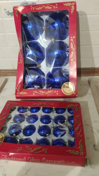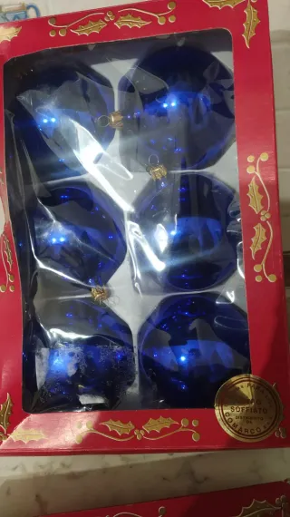Set di addobbi natalizi per l'albero di Natale. - Palline di vetro soffiato. - Colore blu intenso. - Decorazioni tradizionali. 10 euro cada - Sfere bianche in plastica 10 euro - Scatola assortita plastica 10 euro - Scatola Sfere blu e oro plastica nuove 15 euro