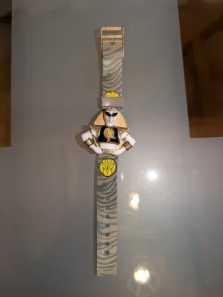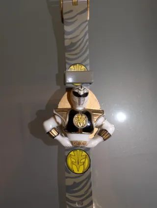 Orologio da polso vintage funzionante con design ispirato ai Mighty Morphin Power Rangers, prodotto nel 1993 da Gordy Time - Cinturino con motivo zebrato. - Figura del White Ranger al centro. - Dettagli dorati e bianchi.