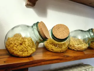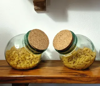 Set di quattro barattoli in vetro con tappo in sughero, perfetti per conservare pasta o altri alimenti. - Design a forma di anfora. - Tappi in sughero naturale.