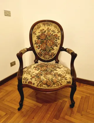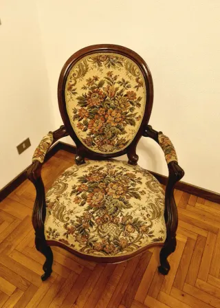 Elegante poltrona d'epoca con una splendida tappezzeria floreale. Presenta elementi tipici sia dello stile Luigi Filippo (schienale a medaglione) che dello stile vittoriano (intagli elaborati, braccioli aperti e gambe cabriole con rotelle). La struttura è in legno massello, intagliato a mano. Il rivestimento è in tessuto floreale. Struttura, imbottitura e tessuto in ottime condizioni