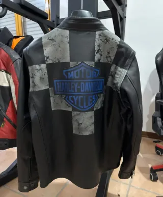Giacca in pelle con un design a scacchiera unico. É possibile rimuovere le maniche tramite zip e diventare un gilet - Patch Harley-Davidson sul petto. - Dettaglio numero 1 sul fondo. - Zip frontale e tasche con zip.