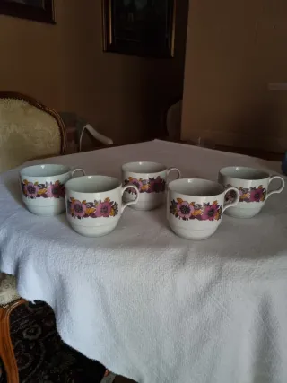Cinque tazze in porcellana italiana con decorazione floreale su un lato. Vintage. anni settanta. Mai usate. Come nuove. Made in italy. Marca Monopoli. Diametro cm 9. Alte cm 8,5.