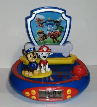 Radiosveglia originale Paw Patrol. Spin Master - Personaggi dei cuccioli. - Design a forma di scudo. - Base colorata con dettagli a tema. Multifunzioni..... luce notturna radio Proiettore dell'ora sulla parete Orologio Rumori del personaggio premendolo alla base Sveglia Perfetto in estetica e funzionamento Funzionante a batterie, incluse. Contattatemi se interessati per info e chiarimenti