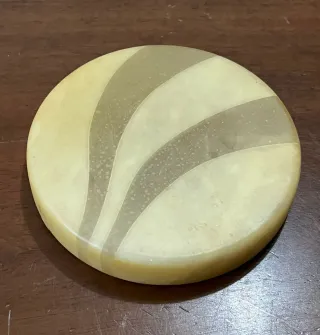 Elegante posacenere o svuotatasche in onice perfetto per aggiungere un tocco retrò alla tua casa. Il design a fasce alternate crea un motivo visivo interessante. - Materiale: pietra - Colore: giallo e beige - Design: a fasce curve circonferenza 12cm.