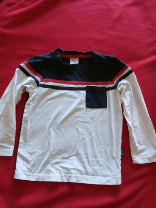 Maglia a maniche lunghe per bambino, con dettagli a contrasto. - Colore principale bianco. - Maniche lunghe. - Taschino applicato sul petto. - Dettagli a righe rosse e blu sul petto. - Collo rotondo.