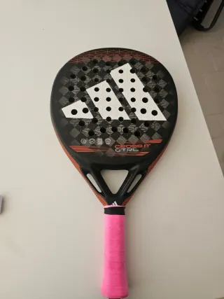 Racchetta da padel Adidas modello Cross It Ctrl. - Design nero con dettagli arancioni. - Logo Adidas bianco a tre strisce. - Impugnatura rosa,ma da cambiare - Superficie forata.