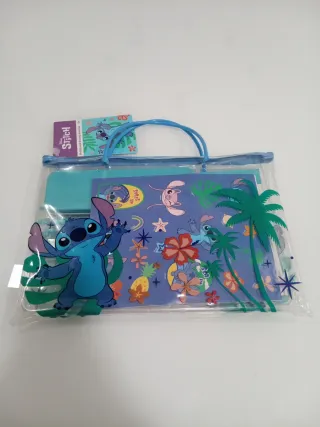 Set di cancelleria a tema Stitch, contenuto in una pratica borsa trasparente. - Borsa con manici azzurri. - Design con Stitch e palme. - Include astuccio, penna,matita,5 colori,gomma , temperino,riga,libricino e adesivi