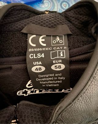 Giacca moto Alpinestars, taglia 58 (USA 48), in pelle nera. - Omologata CE Cat II CLS4. - Ottime condizioni.