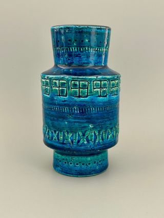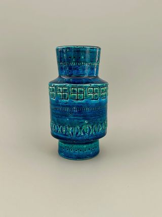 Vaso a rocchetto vintage della celebre serie Rimini blu realizzato da Aldo Londi per Bitossi ceramiche. Ceramica e terracotta decorata e smaltata a mano. Dimensioni: altezza circa 15 cm e larghezza circa 8 cm. Ottime condizioni..