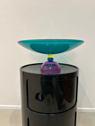 Grande alzata centrotavola anni ’90 in plexiglass colorato delle serie ‘Colors’, design di STG Studio per Guzzini. La scelta dei colori e il suo design postmoderno ricordano lo stile del gruppo Memphis. Può essere utilizzata da entrambi i lati, la parte verde più ampia mentre la parte viola diventa una ciotola più profonda. Complemento perfetto per portare in tavola design e colore. Made in Italy. Dimensioni: D 33 x H 15 cm Materiale: Plexiglass Condizioni: ottime, minimi segni del tempo