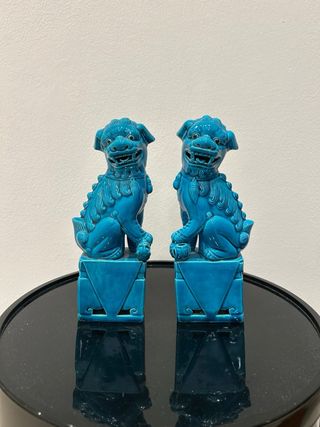 Coppia draghi leoni cani di foo in ceramica terracotta smaltata. Dimensioni: altezza circa 20 cm Ottime condizioni, minimi segni del tempo. I Cani di Foo - anche chiamati leoni guardiani cinesi - sono statue tradizionali usate in Cina (e in altre culture asiatiche) come simboli di protezione e forza spirituale.
