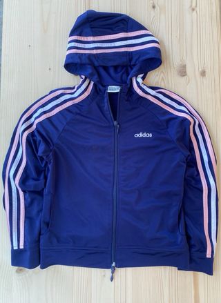 Giacca sportiva da bambina Adidas originale, perfetta per un look casual o per l'attività fisica. Marca: Adidas Colore: Blu scuro (o viola/navy, vedi foto) con le iconiche 3 strisce rosa chiaro e bianche sulle maniche. petto.