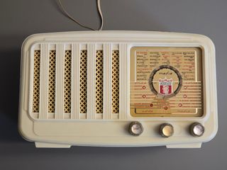 Un tuffo nel passato con un pezzo di storia che ha il fascino degli anni ’50. Prodotta dalla leggendaria Europhon a Milano nel 1955, è un’icona del design italiano. La struttura è in bachelite color avorio, il quadrante color crema, con le sue tonalità calde e vintage, aggiunge un tocco di raffinatezza. Al centro, il logo Kosmophon simbolo di qualità e tradizione. Ogni dettaglio parla di un’epoca in cui Europhon dominava il panorama dell’elettronica italiana, creando non solo radio, ma oggetti di design capaci di conquistare gli appassionati di tutto il mondo. Dimensioni: 24,5x14,5x10,5 cm. Onde medie e corte.