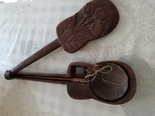 Antico bilancino in legno, ideale per uso decorativo. Presenta un design intagliato con motivi floreali e un volto stilizzato. - Materiale: Legno - Uso: Decorativo - Stile: Vintage