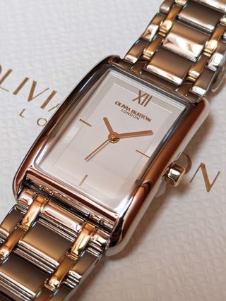 ⌚ Vendo orologio da donna Olivia Burton – Collezione GROVE, nuovo e dal design raffinato, perfetto per chi ama lo stile classico con un tocco moderno ✨ Caratteristiche principali Movimento al quarzo a 3 lancette, preciso e affidabile Cassa rettangolare elegante in acciaio inox (23,2 mm – spessore 7,55 mm) Quadrante bianco argento con effetto scintillante e finitura a raggi di sole Indici minimalisti per un look pulito e sofisticato Bracciale bicolore (argento e oro) in acciaio inox ionico placcato oro a 5 maglie, lucido ed elegante Resistenza all’acqua 3 ATM Vetro minerale resistente Chiusura deployante Prezzo negozio €169