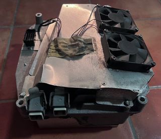 Caricabatterie originale per scooter elettrico Vectrix VX-1. - Colore argento. - Design compatto e robusto. - Dotato di ventole per il raffreddamento. - Connettori di alimentazione e dati inclusi.