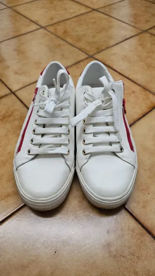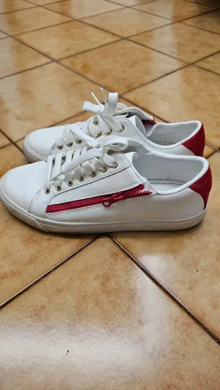 Eleganti scarpe Zara da ginnastica in pelle bianca, perfette per un look casual ma curato. Taglia 40. Presentano un vivace dettaglio rosso che aggiunge un tocco di colore. - Tomaia in pelle bianca. - Dettagli laterali rossi. - Chiusura con lacci bianchi. - Suola in gomma.