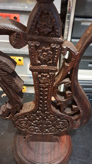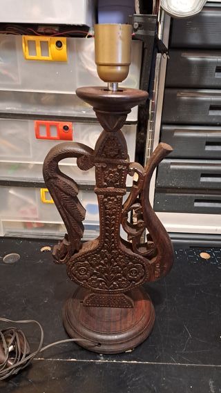 Bellissimo lume in legno con intarsi. - Realizzato in legno scuro. - Presenta dettagli intarsiati floreali e decorativi.