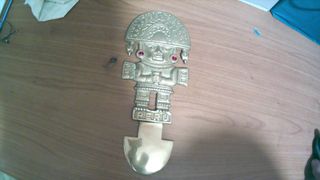 Amuleto decorativo in ottone, con un design ispirato alla cultura peruviana. Presenta dettagli finemente lavorati e inserti rossi. - Materiale: Ottone - Decorazione: Motivi tradizionali peruviani - Dettagli: Inserti rossi sugli orecchini