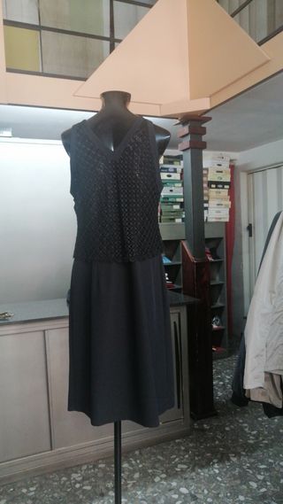 Abito Mario Pucci Cecconi, nero giro manica con inserto in pizzo macrame e giacchino manica 3/4. Taglia 44, nuovo con cartellino.