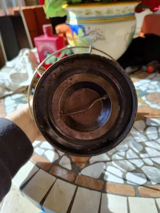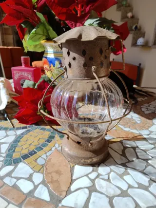 Lampada a petrolio dal design classico, perfetta per creare un'atmosfera suggestiva. - Base e serbatoio in vetro colorato. - Meccanismo in metallo per la fiamma.