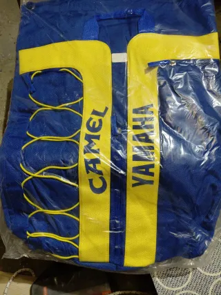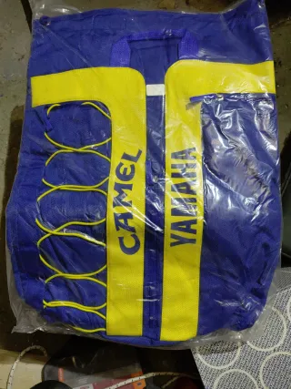 Zaino con logo Camel e Yamaha. - Colore blu e giallo. - Cinghie regolabili. - Tasca esterna con zip.