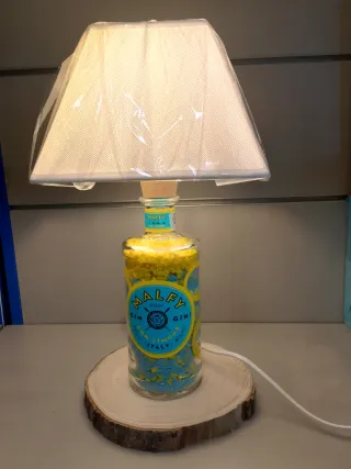 Lampada decorativa realizzata con una bottiglia di Malfy Gin con Limone. Un pezzo unico per arredare con stile. - Riempimento interno con pietre colorate blu e gialle. - Paralume in tessuto color crema.