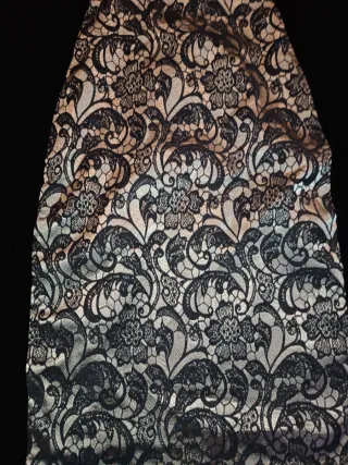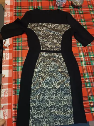 Elegante vestito con dettagli in pizzo. - Maniche a tre quarti. - Inserti in pizzo dorato sul davanti. - Tessuto principale nero.