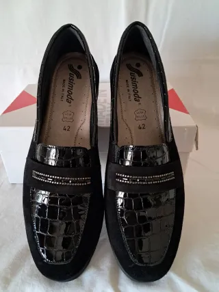 Mocassini da donna Susimoda, marchio italiano, sinonimo di comfort e qualità Pelle e nabuk, con inserti in vernice nera con stampa coccodrillo sulla parte anteriore e sul tallone. L'interno e il sottopiede estraibile sono in pelle, mentre il fondo è in gomma. Decorazione con strass o piccoli cristalli sopra la mascherina di vernice e sono un modello slip-on senza lacci. Progettate per essere comode, calzata larga, zeppa di circa 4 cm.