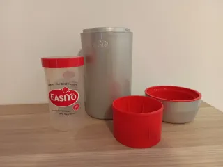 Set per la preparazione dello yogurt Easiyo. - Contenitore trasparente con coperchio rosso. - Contenitore interno grigio. - Accessorio rosso aggiuntivo. Privo di istruzioni