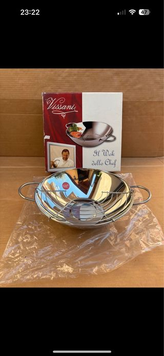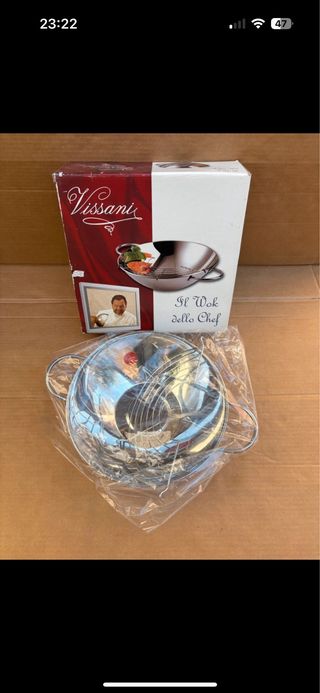 Wok Vissani nuovo, mai usato, ancora nella sua confezione originale. - Design elegante e funzionale. - Manici robusti per una presa sicura. - Ideale per la cucina asiatica e non solo.
