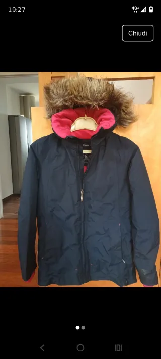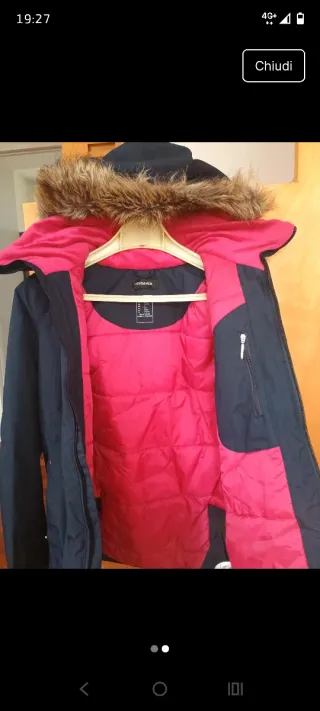 Piumino Decathlon con cappuccio bordato in pelliccia sintetica. - Chiusura frontale con zip. - Tasche laterali con zip. - Fodera interna imbottita.