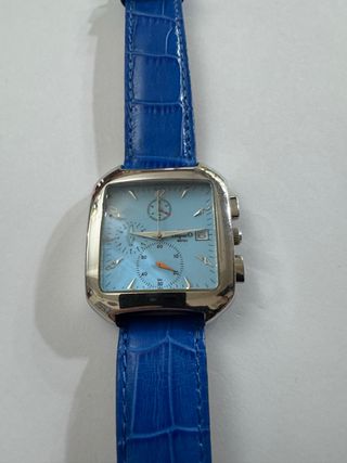 Elegante orologio cronografo LMImpero con cinturino in pelle blu e cassa in acciaio. - Quadrante azzurro. - Dettagli argentati. - Cinturino in pelle blu con texture. - Funzione cronografo.