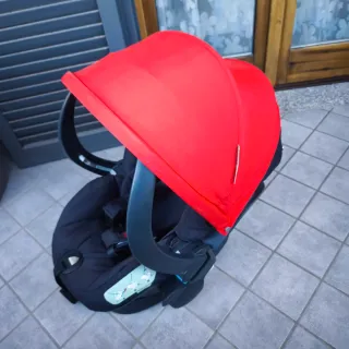 Seggiolino auto Stokke BeSafe di colore rosso e nero. - Cappottina parasole rossa. - Base nera. - Logo Stokke BeSafe visibile.