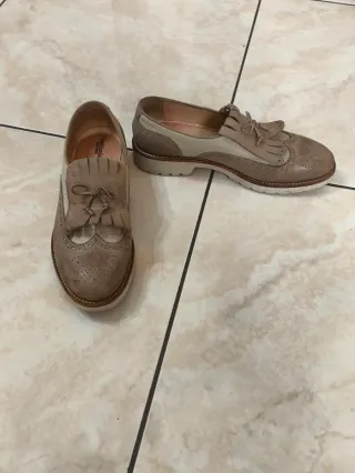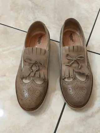 Eleganti francesine da donna in vera pelle. - Modello stringato con nappine e frange. - Dettagli traforati sulla punta. - Suola in cuoio e gomma.