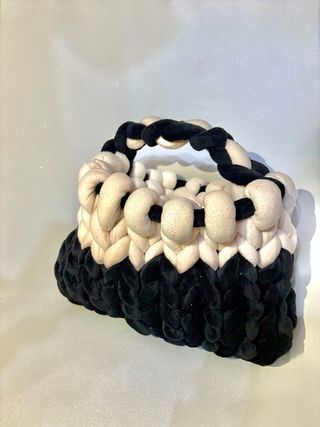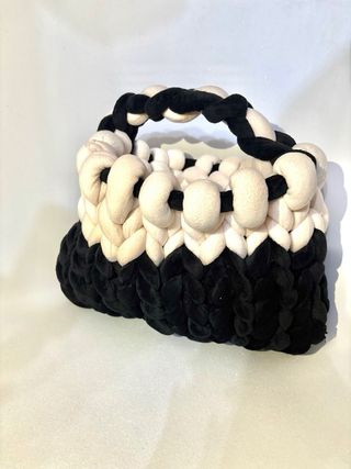 Borsa realizzata con filato marshmallow, un accessorio unico e di tendenza. - Design bicolore con filato beige e nero. - Manico intrecciato per un look distintivo. - Materiale morbido e voluminoso.