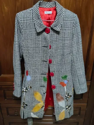 Elegante cappotto Martyia con un classico motivo a quadri e dettagli colorati. - Fodera interna in raso rosso. - Bottoni rossi a contrasto. - Applicazioni decorative floreali e astratte. - Design a quadri bianco e nero.