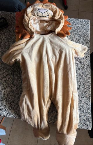 Vestito di carnevale a tema leone per neonati. - Taglia 6/9 mesi. - Morbido tessuto color sabbia. - Cappuccio con muso e criniera da leone. - Dettagli ricamati sul muso.