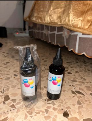 Bottiglie di inchiostro per stampante. - Colore nero. - Etichetta con bolle colorate (ciano, magenta, giallo). - Tappo a vite nero.