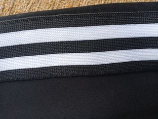 Questi leggings neri lucidi presentano un design sportivo con doppie strisce bianche laterali. - Tessuto elasticizzato per comfort. - Strisce bianche a contrasto lungo le gambe.
