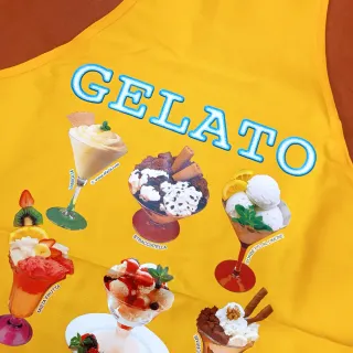 Grembiule da cucina giallo vivace, decorato con una vivace stampa a tema gelato. - Design colorato con diverse varietà di gelati e sorbetti. - Scritta GELATO in rilievo. - Perfetto per chi ama cucinare o per un tocco di allegria in cucina.