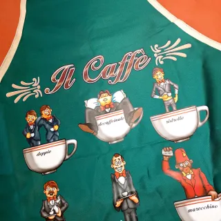 Grembiule da cucina con tema Il Caffè. - Design con illustrazioni di personaggi e tazze di caffè. - Colore principale verde acqua con bordi bianchi. - Taglia unica.